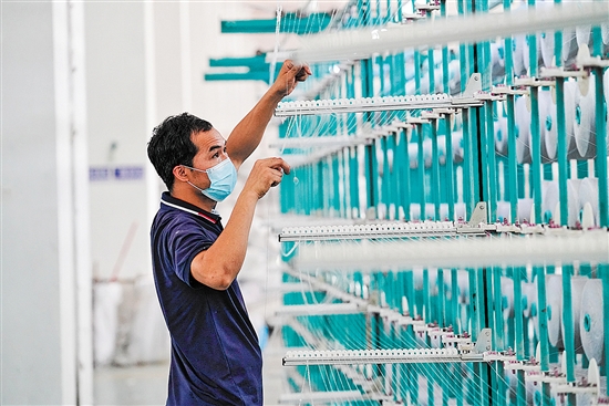 广西澳纺纺织品有限公司内,工人正在纺纱车间作业。